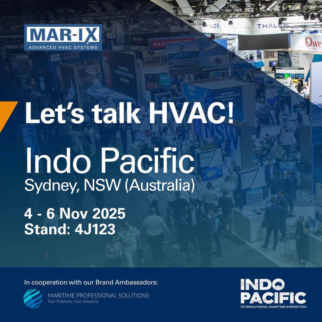 Together with our Australian Brand Ambassador Maritime Professional Solutions (MPS), MAR-IX will be present at stand 4J123 at the International Convention Centre (ICC) in Sydney. On display we have a modular MAR-IX chiller system with integrated heat-recovery, designed for outstanding energy efficiency and reliability in demanding marine environments.